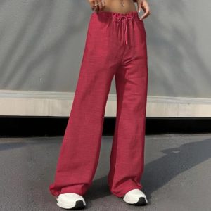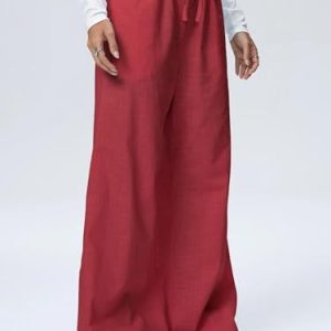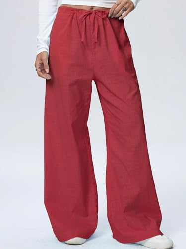 Cotton Pants Women, Wide Leg Lounge Pants for Women, Drawstring Waist Casual Pant Red XXL at Women’s Clothing store