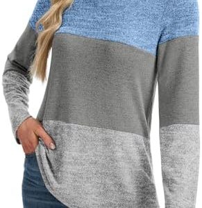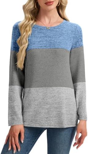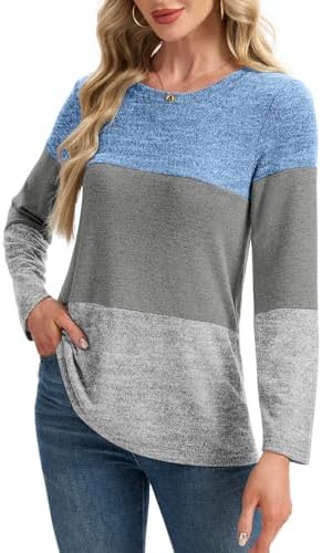 Kinnette Womens Long Sleeve Tops Color Block 2025 Casual Fall Lightweight Tunic Sweaters Crew Neck Shirt (Blue/Gray/Light Gray, XL) at Women’s Clothing store