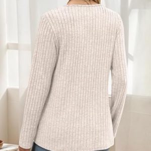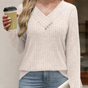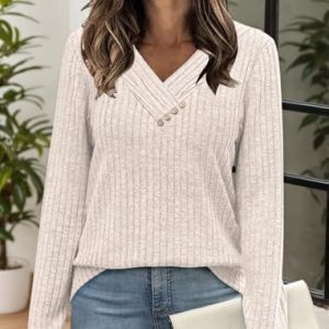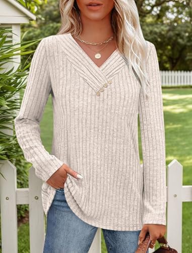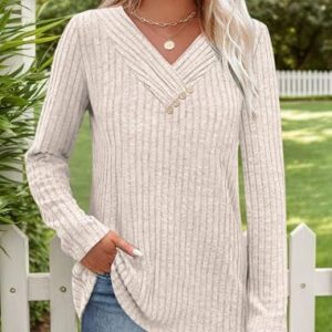 Lightweight Sweaters for Women V Neck Sweatshirts Tunic Tops with Buttons Fall Fashion Outfits Winter Clothing 2025 Apricot at Women’s Clothing store