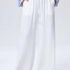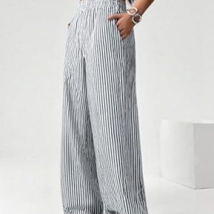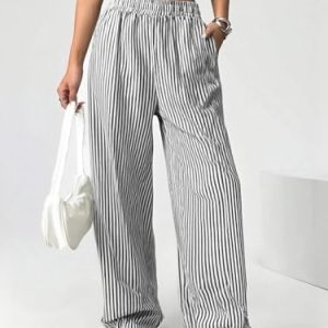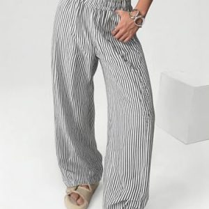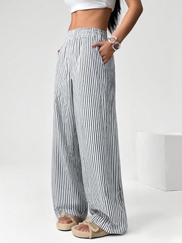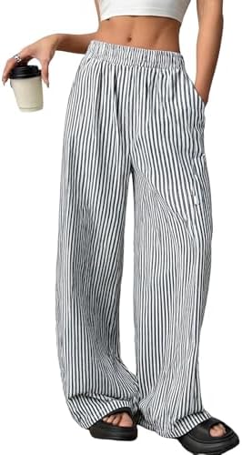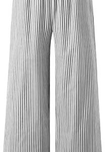 Women Linen Pants Wide Leg Striped Pant Elastic Waist Casual Lounge Loose Track Trousers with Side Pockets Black S at Women’s Clothing store
