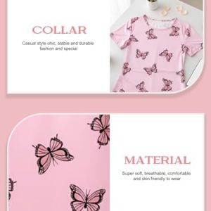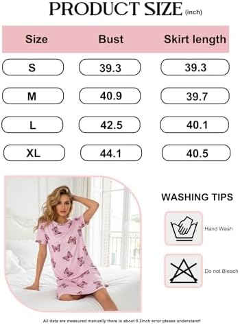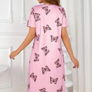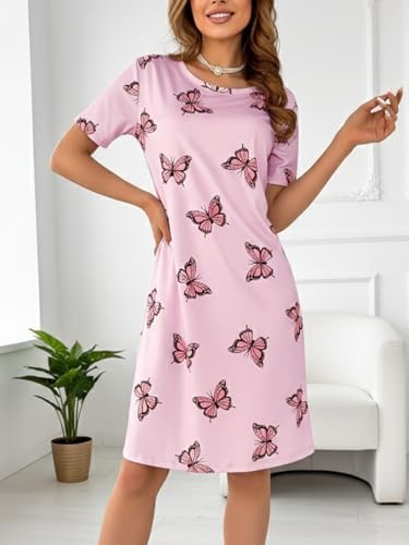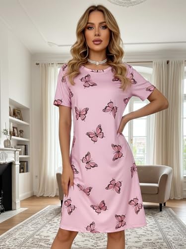 Women Sleep Dress, Butterfly Print Nightgown, Casual Short-Sleeve Sleepwear Dress, Loungewear Dress with Relaxed Fit Pink at Women’s Clothing store