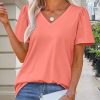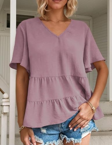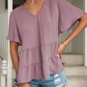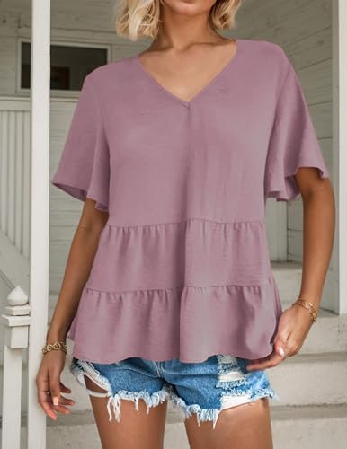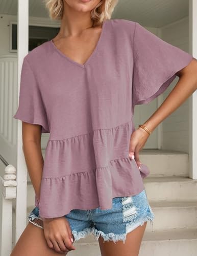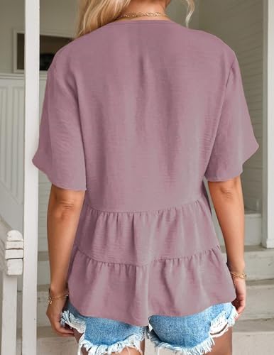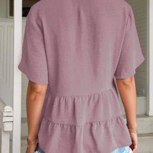 Women’s Casual Ruffle Short Sleeve Blouses Crewneck Loose Tops Pink at Women’s Clothing store