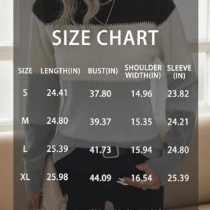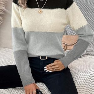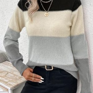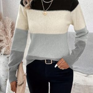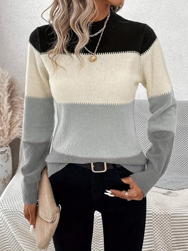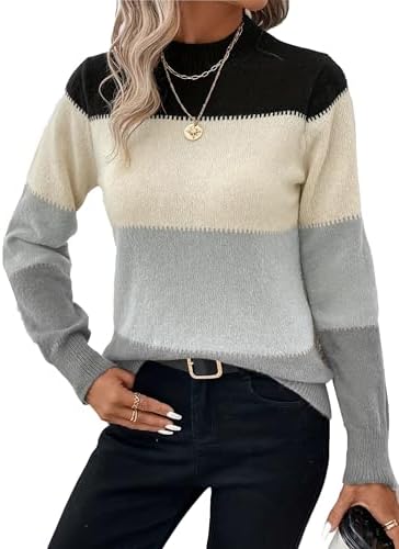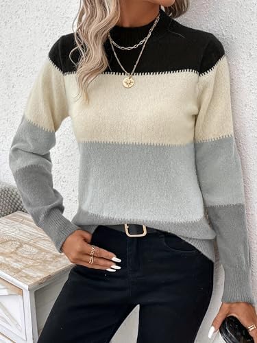 Womens Crewneck Long Sleeve Color Block Knitted Trendy Casual Fashion Knit Sweaters 2025 Black S at Women’s Clothing store