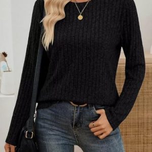Women’s Crewneck Sweater Tops – Long Sleeve Knitted Casual Fall Winter Blouse(Black) S at Women’s Clothing store