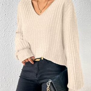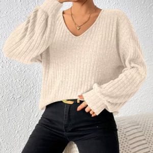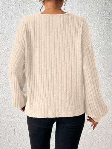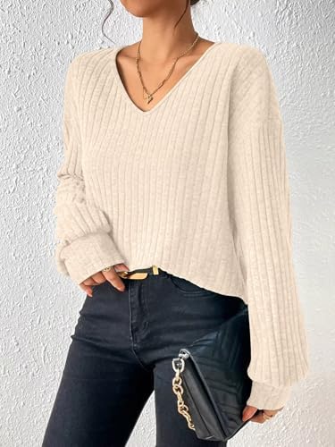 Women’s Fall V Neck Sweaters 2025 Loose Fit Lightweight Casual Tunic Fashion Tops Apricot at Women’s Clothing store