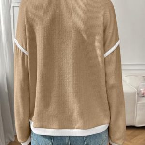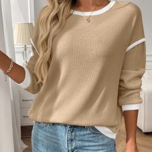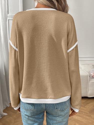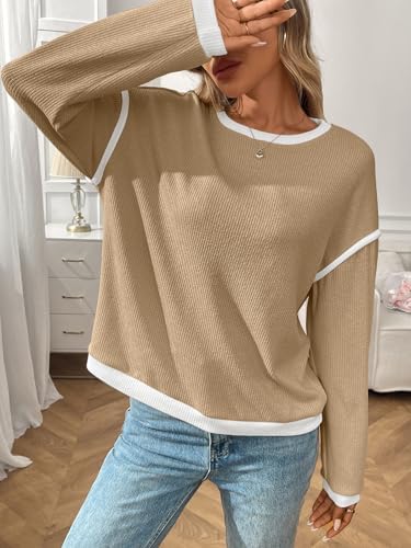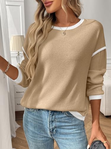 Women’s Fashion Crewneck Pullover Sweater Casual Color Block Ribbed Knit Tops Loose 2025 Fall Tops Kahki at Women’s Clothing store