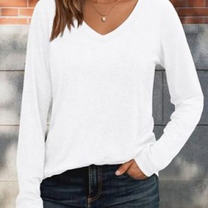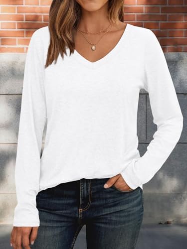 Womens Long Sleeve Shirts V Neck Casual Tops Loose Dressy Basic Fall Fashion Trendy Clothes White at Women’s Clothing store
