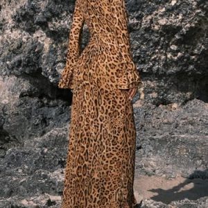 Women’s Long Sleeve V Neck Bell Sleeve High Slit Flounce Stretchy Fit Flare Leopard Print Party Casual Dress Brown XS : Clothing, Shoes & Jewelry