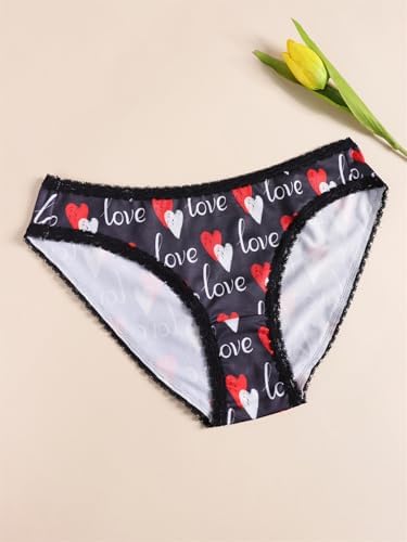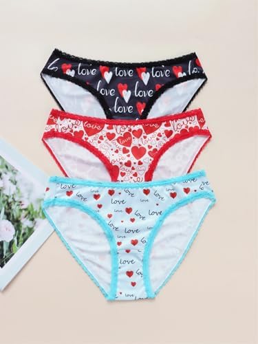 Women’s Love Heart Print Bikini Panties, Lace Trim, 3 Pack, Black Red Blue at Women’s Clothing store