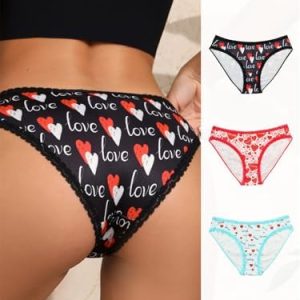 Women’s Love Heart Print Bikini Panties, Lace Trim, 3 Pack, Black Red Blue at Women’s Clothing store