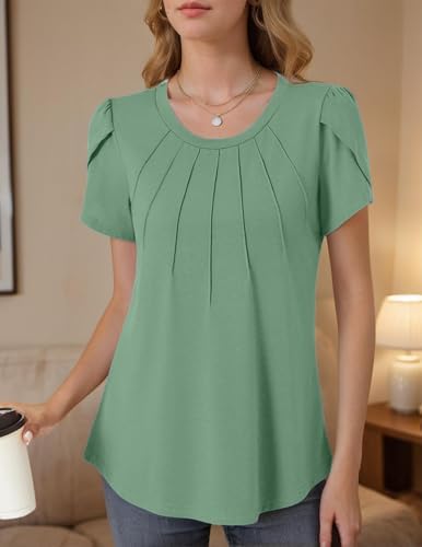 Womens Pleated Casual Summer Tops Short Sleeve Round Neck Shirts Green Grey at Women’s Clothing store