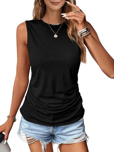 Women’s Summer Sleeveless Shirt Crew Neck Ribbed Fabric Solid Elastic Loose Fit Soft Casual Basic Versatile Top Black S at Women’s Clothing store